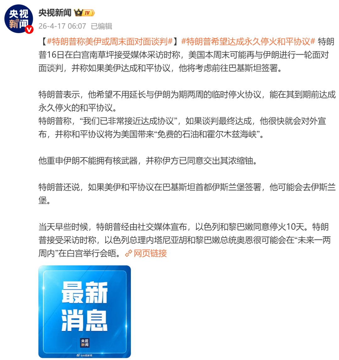 据央视新闻:特朗普16日在白宫南草坪接受媒体采访时称,美国本周末可能再与伊朗进行一轮面对面谈判,并称如果美伊达成和平协议,他将考虑前往巴基斯坦签署。